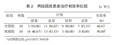 觀察組患者的有效率為90.00%,明顯高于對照組的46.67%(P<0.05)(表2)。