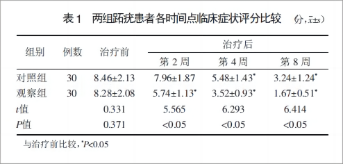 ③疼痛程度,劇烈疼痛 3 分,一般疼痛 2 分,微痛1分,無痛0分;記錄患者在治療前、治療第2周、第 4 周及第 8 周的癥狀評分,分數(shù)越高表示癥狀越嚴重。