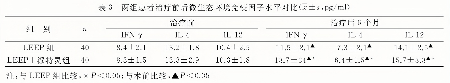且LEEP+派特靈組IFN-γ和IL-12水平上升和IL-4水平下降幅度相比于LEEP組均有統(tǒng)計(jì)學(xué)意義(P<0.05)?