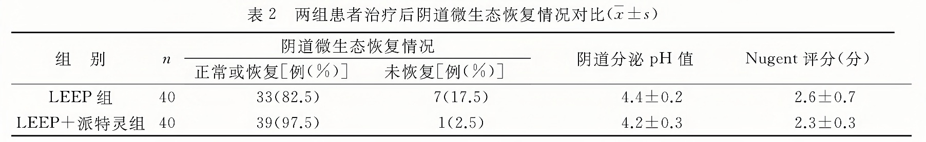 LEEP+派特靈組治療后的微生態(tài)恢復(fù)率為97.5%,顯著高于LEEP組的82.5%(P<0.05);