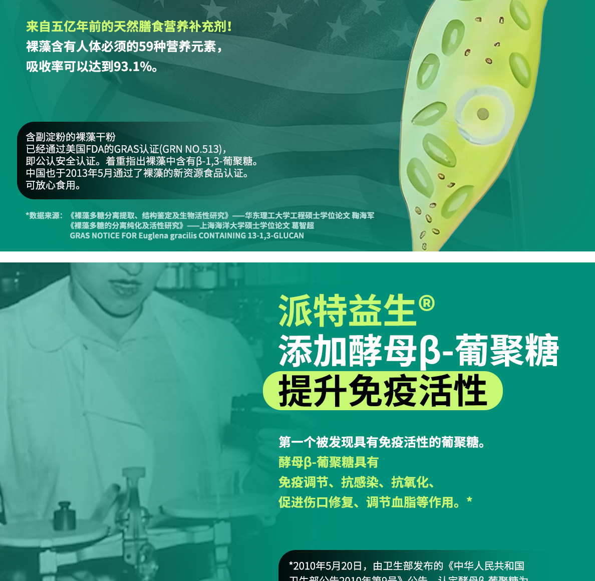 • 添加美國(guó)FDA、GRAS認(rèn)證的酵母β-葡聚糖 | 添加美國(guó)進(jìn)口裸藻粉