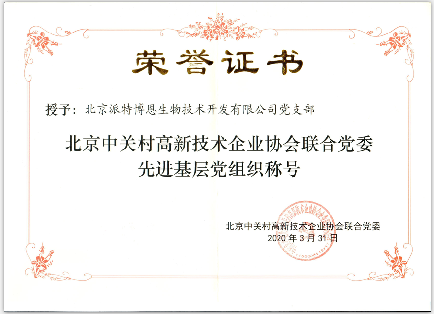 派特公司黨支部自2019年4月15日成立以來,在上級黨組織的領導下,在派特公司總部領導的大力支持下,積極有序地開展了各項黨員活動。 派特公司黨支部榮獲“北京中關村高新技術企業(yè)協(xié)會聯(lián)合黨委先進基層黨組織稱號”。