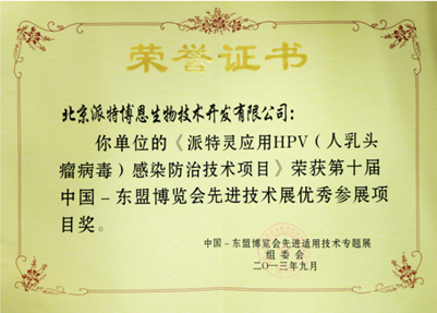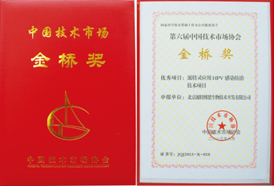 2013年,“派特靈應(yīng)用HPV感染防治技術(shù)項目”榮獲第六屆金橋獎優(yōu)秀項目獎。
