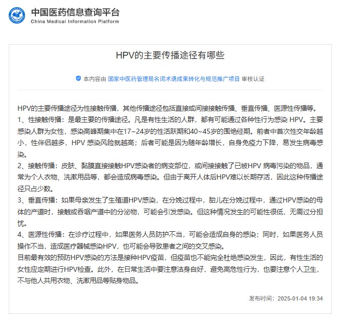 (?中國醫(yī)藥信息查詢平臺上關(guān)于HPV主要傳播途徑的介紹)
