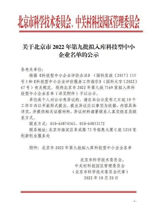 2022年10月,經(jīng)北京市科學(xué)技術(shù)委員會(huì)、中關(guān)村科技園區(qū)管理委員會(huì)組織各區(qū)評(píng)價(jià)工作機(jī)構(gòu),根據(jù)《科技型中小企業(yè)評(píng)價(jià)辦法》(國(guó)科發(fā)政〔2017〕115 號(hào))和《科技型中小企業(yè)評(píng)價(jià)服務(wù)工作指引》(國(guó)科火字〔2022〕67號(hào))有關(guān)規(guī)定,評(píng)定北京派特博恩生物技術(shù)開(kāi)發(fā)有限公司入庫(kù)北京市2022年第九批科技型中小企業(yè)。
