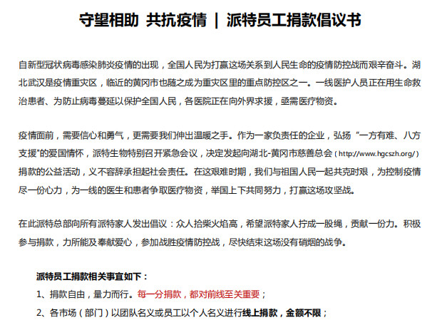 本次“守望相助 共抗疫情”派特公司員工捐款信息,可在派特學院-資料中心-公益項目欄目查看。