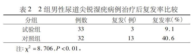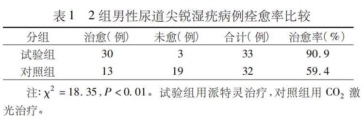 將65例男性尿道尖銳濕疣患者隨機(jī)分成派特靈治療試驗組(33例)和CO2激光治療對照組(32例),隨訪3個月,比較2組的治愈率、復(fù)發(fā)率和不良反應(yīng)。