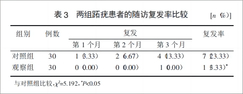 隨訪3個月,對照組共有7例復發(fā)(23.33%),觀察組1例復發(fā)(3.33%),2組復發(fā)率比較差異具有統(tǒng)計學意義(P<0.05)(表3)。