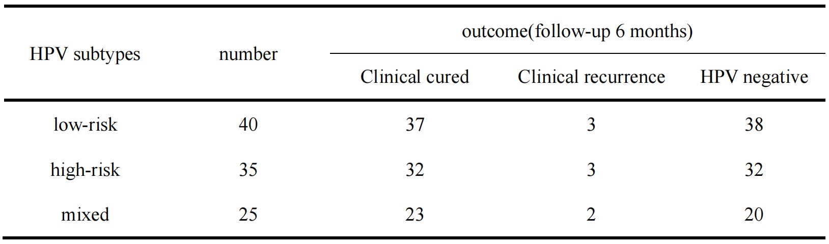One  hundred  condyloma  acuminatum patients  completed  five  weeks  of  treatment. The  therapeutic evaluation  was  based  on  the  clinical outcomes  both  before  and after 6 months of follow-up, as  well  as  whether  the  HPV  virus  was determined  to  be  negative  or  not  (Figure  1). Ninety-two  of  the  patients  were  clinically  cured  and exhibited no recurrence, and eight exhibited improvements but recurrences after follow-ups for 2 to 3 months.The incidences of HPV virus were reexamined after 6 months of follow-ups. Ninety of the clinically  cured  patients exhibited negative  indications, two of the patients were determined to be positive  for  HPV  and  eight  recurrence  patients  were still demonstrated  to  be  positive  for  HPV.  Six months after treatment, the numbers of negative cases of low-risk, high-risk and mixed types of HPV were 38,32 and 20,respectively (Table 1). There was no statistical difference among different HPV subtypes in clinical outcomes and HPV clearance (P>0.05).