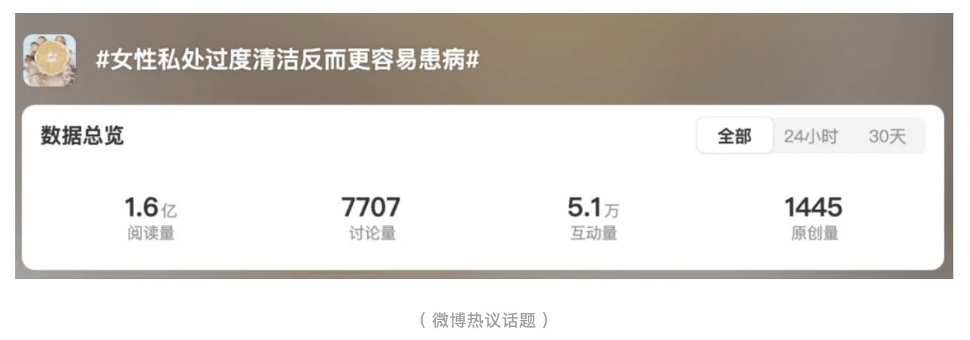 最近,微博上的一條熱搜引起了大家的關(guān)注——“女性私處過度清潔反而更容易患???”。截止截稿,該話題已被1.6億人瀏覽、討論。